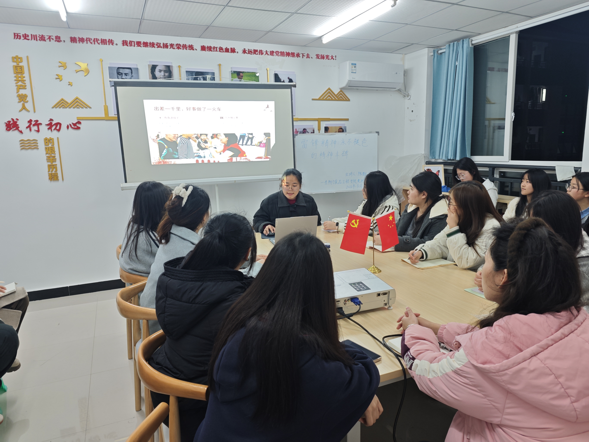 为深入学习贯彻雷锋精神,引导广大学生传承红色基因、践行使命担当,3月14日20:00,我院初心工作站于蓝雾苑2舍4楼活动室开展第20期“主题教育”活动。本次活动以“雷锋精神——永不褪色的精神丰碑”为主题,由陈飘絮同学领学,围绕雷锋生平事迹、经典故事、精神内涵及时代价值展开。共计21名同学参加此次学习。