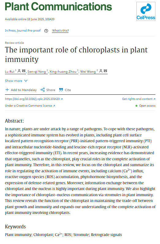 近日,必赢国际437教师芮璐以第一作者和共同通讯作者身份,与福建农林大学王伟教授合作在植物学国际卓越期刊《Plant Communications》(中国科学院一区TOP期刊,最新影响因子11.6)上发表题为《The important role of chloroplasts in plant immunity》的综述论文。该论文系统总结了近年来叶绿体在调控钙离子内流、活性氧(ROS)积累、植物激素生物合成以及叶绿体—细胞核逆行信号等免疫激活事件中的核心作用,阐释了叶绿体在维持植物生长与免疫平衡方面的重要功能,拓展了植物免疫系统中涉及叶绿体通路全面激活的理解视角,对未来抗病植物分子育种提供了理论依据与研究方向。