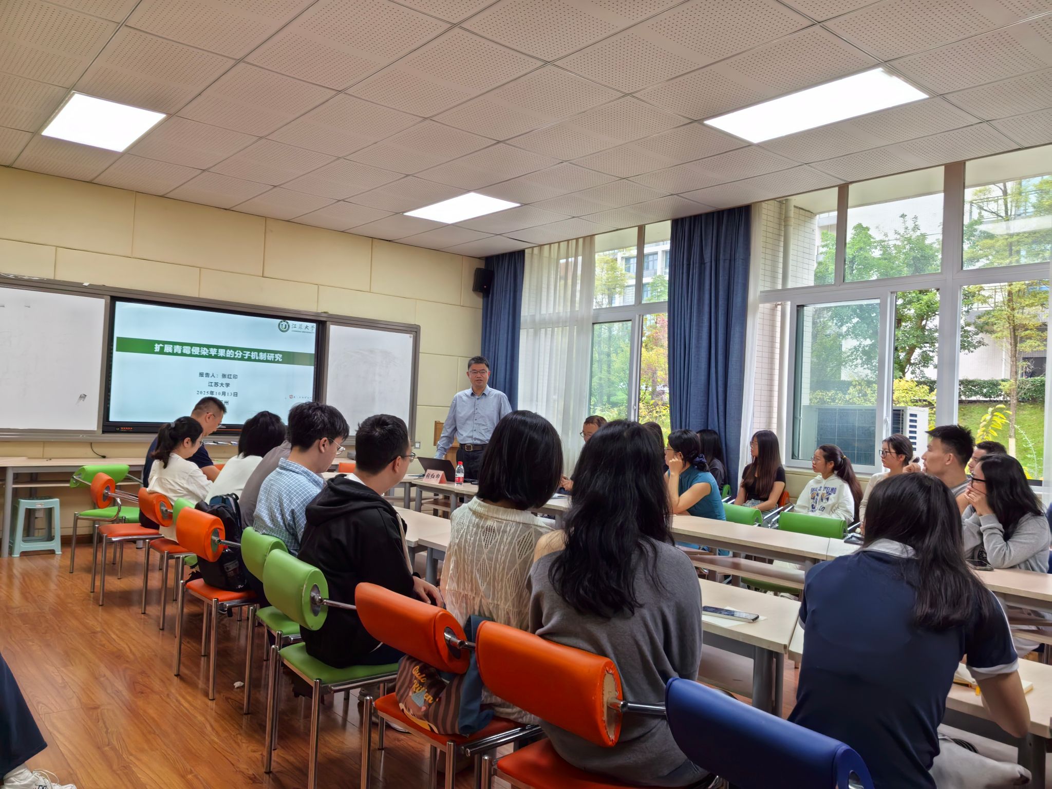 在互动交流环节中,教师芮璐就果实感病性机制及实验细节问题进行了交流;研究生向飞针对真菌侵染果实的共同特征进行了提问。张教授对师生提出的问题进行了详细解答,并分享了相关研究的思路与实验经验,现场学术氛围浓厚。