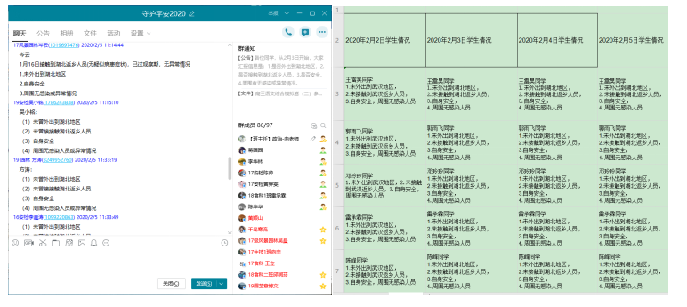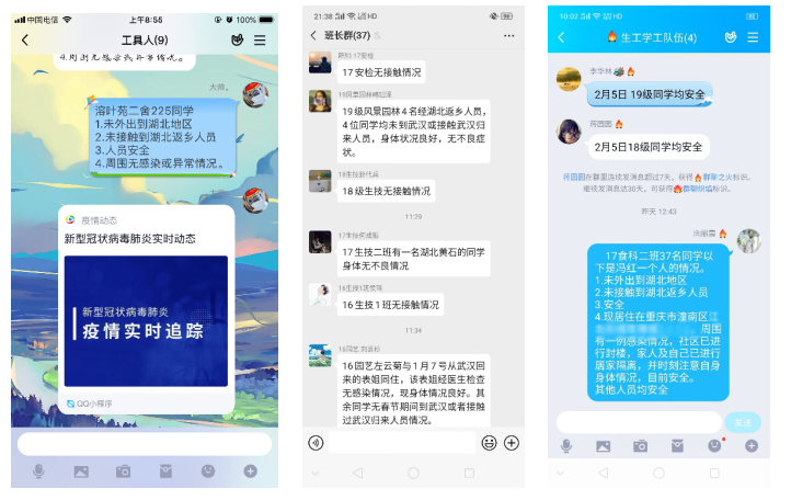 根据前期掌握的学生情况和学校调查问卷反馈情况,筛查重点关注人群,一对一进行电话和QQ排查,建立信息台账。建立QQ群“守护平安2020”,将(1)湖北籍学生;(2)途径湖北地区的学生;(3)接触过湖北地区返乡人员的学生;(4)周边有疑似新型冠状病毒肺炎病例感染人群的学生;(5)健康状况为其它学生,列为重点关注对象,建立每日信息台账,各年级由专人负责监督和跟踪信息,每日下午13:00汇报年级辅导员。持续汇报第9天,未有新冠肺炎疑似症状的学生。