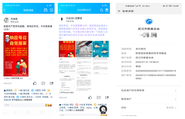 (1)学生党员利用网络新媒体,积极配合学校完成调查问卷,在QQ空间、QQ群、朋友圈等网络平台分享疫情实时动态,宣传防疫知识等。时刻关心同学动态,配合学院彻底摸底排查梳理,以自身防疫为先,号召我院同学为抵御疫情献上绵薄之力,切实发挥好党员先锋模范作用。学生党员田慕镕同志在第一时间向武汉捐款,尽绵薄之力。