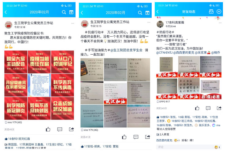 (2)学生公寓党员工作站通过官方QQ发布“大学生疫情防控倡议书”,引导同学们关注自身健康,做好疫情防护措施,积极响应国家号召,做到不造谣,不信谣,不传谣。线上开展“手动加油接力”活动,为“抗疫行动”加油,致敬奋战在一线抗击肺炎的所有工作者。