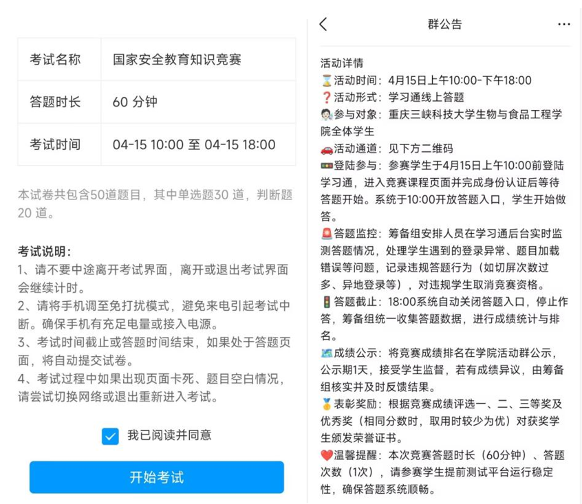 为深入学习贯彻总体国家安全观,普及国家安全法律法规与核心知识,增强青年学生的国家安全意识与责任担当,在4·15全民国家安全教育日来临之际,我院大学生科技协会、大学生就业与创业协会依托学习通平台成功举办“筑牢国安防线,护航青春成长”国家安全知识竞赛,学院全体学生踊跃参与。