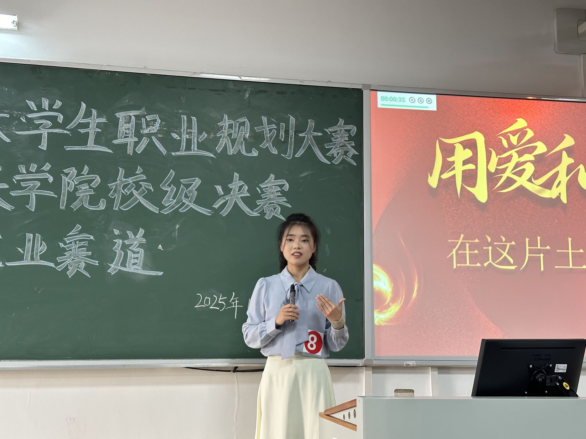 本届大赛以“筑梦青春志在四方,规划启航职引未来”为主题,旨在增强学生职业规划意识与就业竞争力。就业赛道重点考察选手的求职实战能力、岗位胜任力与发展潜力。决赛采用“主题陈述+评委提问”形式进行,黎欢同学围绕“生物疗愈班主任”这一职业目标,清晰阐述了其将心理健康教育融入班级管理的理念与实践路径。她结合自身生物专业背景,提出了通过生物研学、生态鱼缸DIY等特色活动优化班级心理环境的创新思路,并展示了在实习、教研、社会实践等方面积累的扎实经历,获得了评委的认可。
